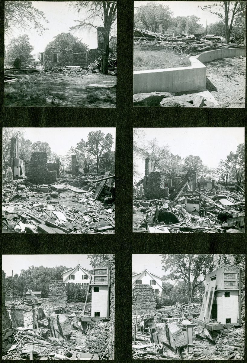 Pages from an album with images from brochures, personal photographs, and newspaper clippings to do with the Old Greenwich Inn, its demolition in 1956, and the later construction of houses on the site.Collection