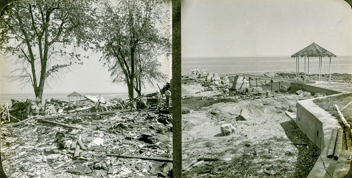 Pages from an album with images from brochures, personal photographs, and newspaper clippings to do with the Old Greenwich Inn, its demolition in 1956, and the later construction of houses on the site.Collection