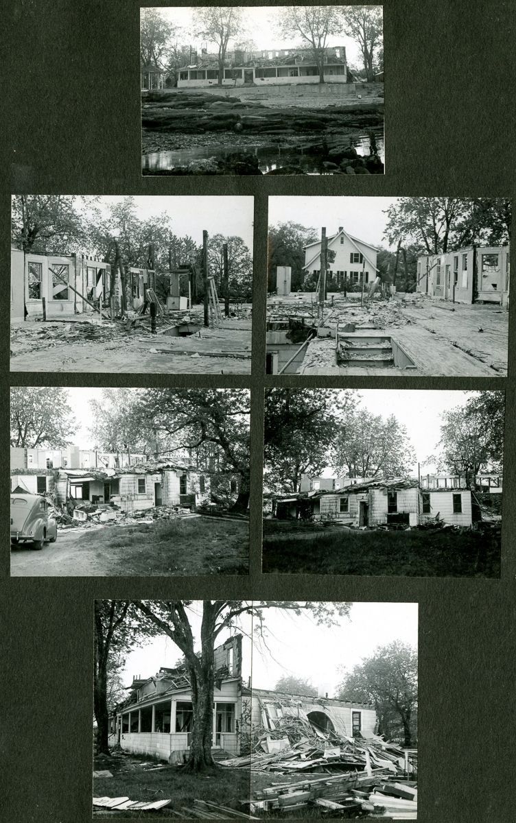 Pages from an album with images from brochures, personal photographs, and newspaper clippings to do with the Old Greenwich Inn, its demolition in 1956, and the later construction of houses on the site.Collection