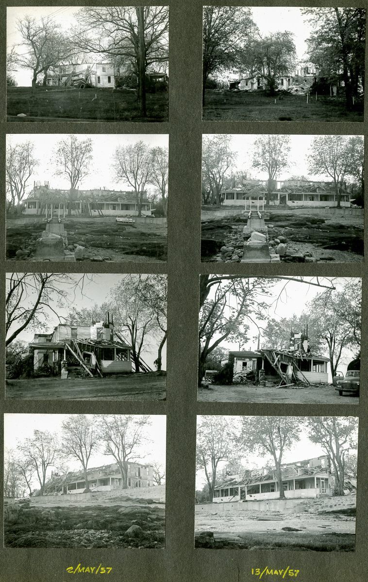 Pages from an album with images from brochures, personal photographs, and newspaper clippings to do with the Old Greenwich Inn, its demolition in 1956, and the later construction of houses on the site.Collection