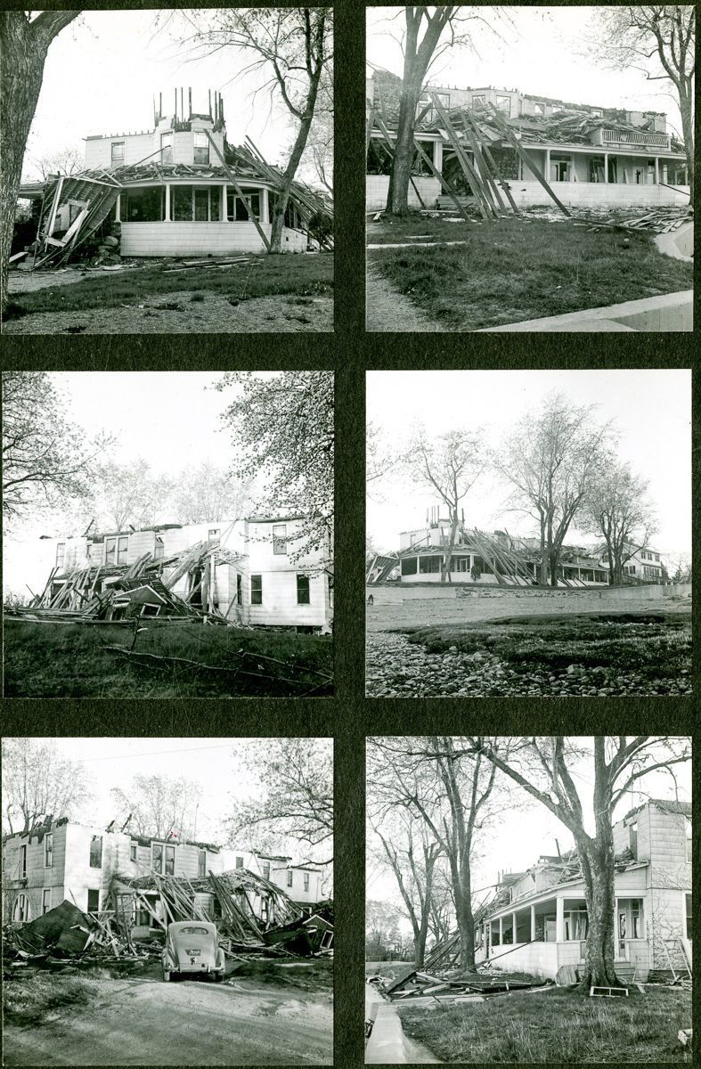 Pages from an album with images from brochures, personal photographs, and newspaper clippings to do with the Old Greenwich Inn, its demolition in 1956, and the later construction of houses on the site.Collection