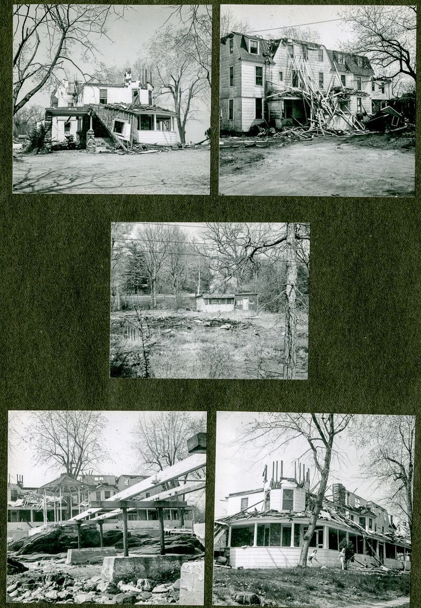 Pages from an album with images from brochures, personal photographs, and newspaper clippings to do with the Old Greenwich Inn, its demolition in 1956, and the later construction of houses on the site.Collection