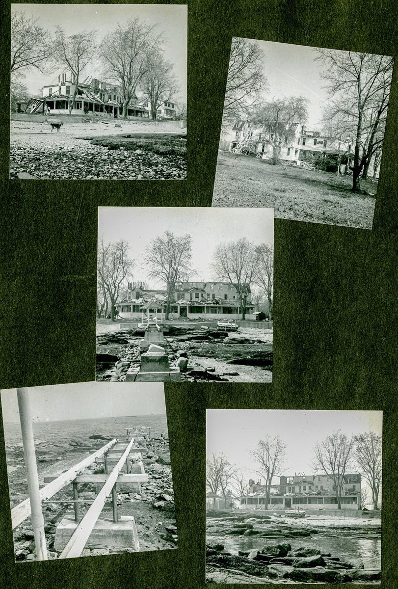 Pages from an album with images from brochures, personal photographs, and newspaper clippings to do with the Old Greenwich Inn, its demolition in 1956, and the later construction of houses on the site.Collection
