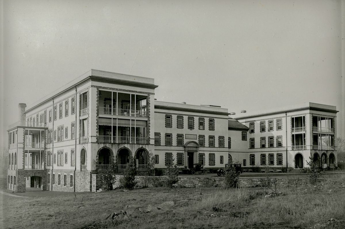 A view of the front of the Greenwich Hospital building built on land and with funds donated by Commodore Elias C. Benedict that opened in 1917.Collection