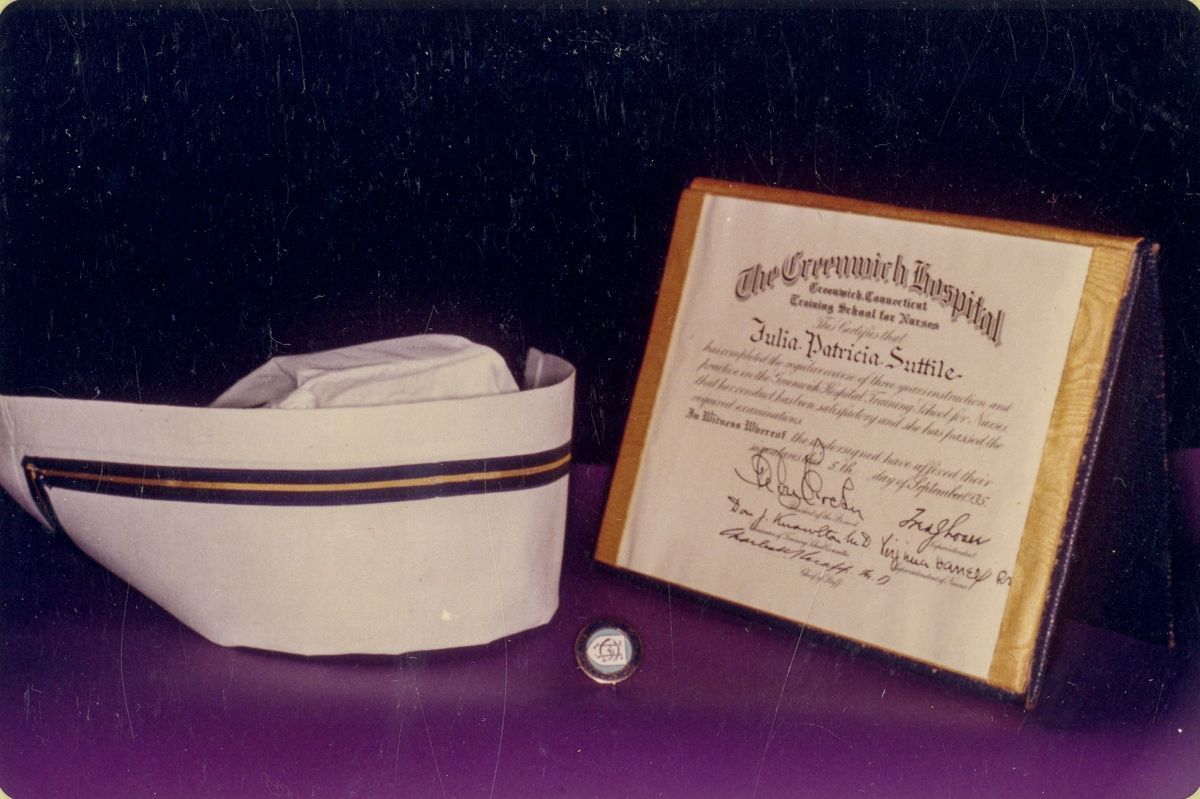 The nurses cap, ring, and diploma of Julia Patricia Suttile, a graduate of Greenwich Hospital's School of Nursing.Collection