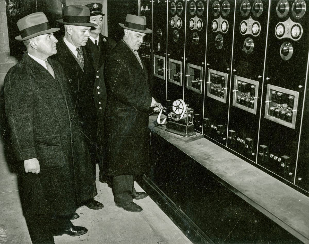 Men performing an inspection of the fire/police building on Havemeyer Place.Collection
