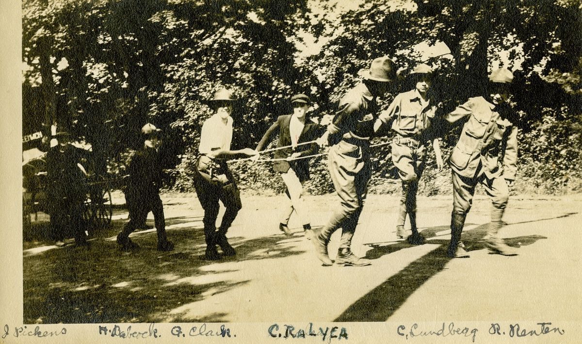 Members of Boy Scout Troop 8 dragging a wagon on a camping trip.