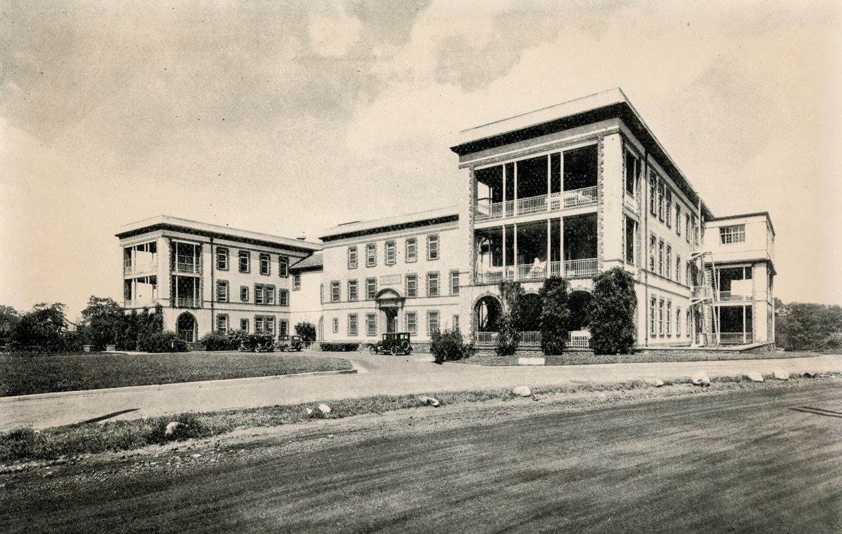 A view of the front of the Greenwich Hospital building built on land and with funds donated by Commodore Elias C. Benedict that opened in 1917.Collection