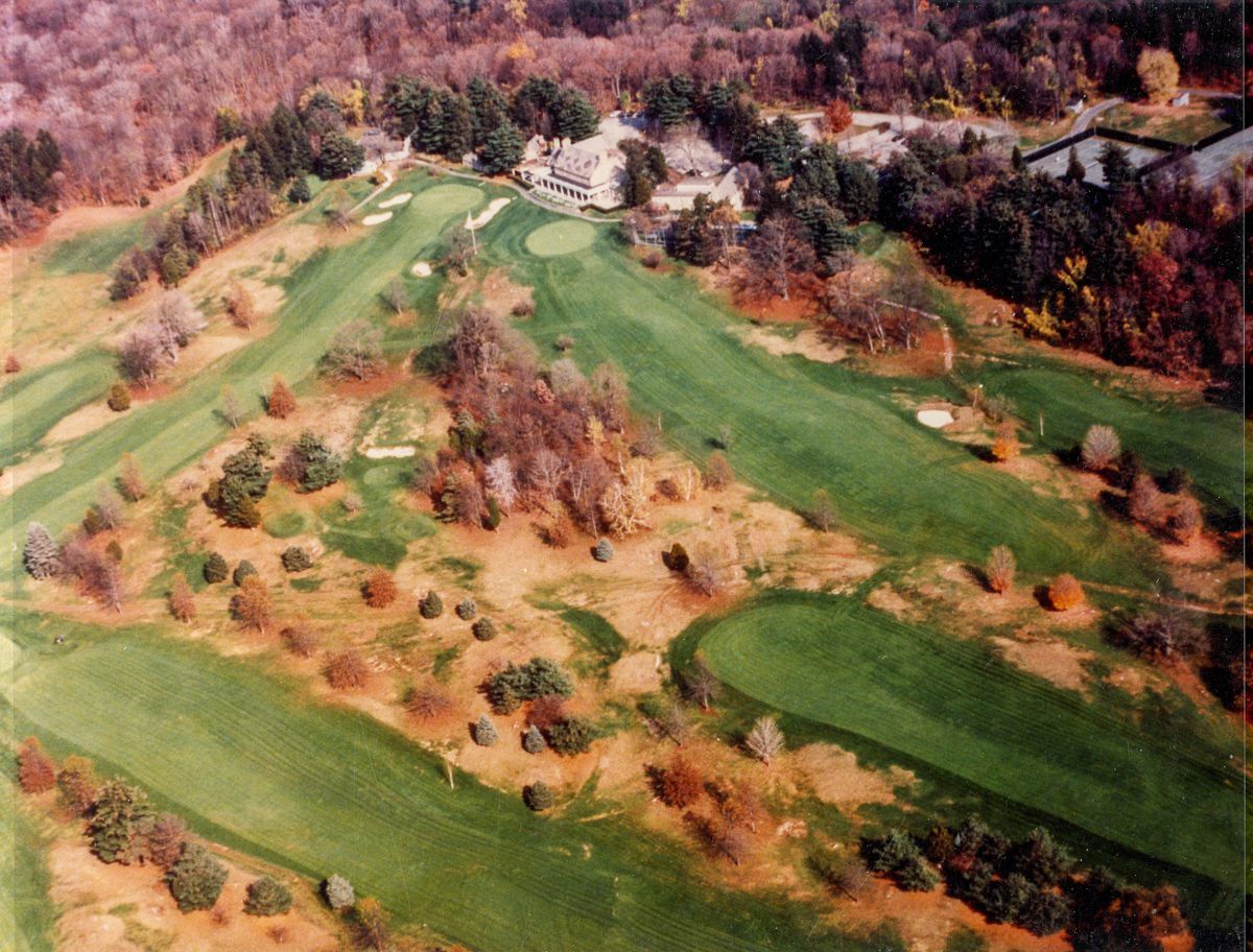 An aerial view of Round Hill Club's Clubhouse and its golf course.