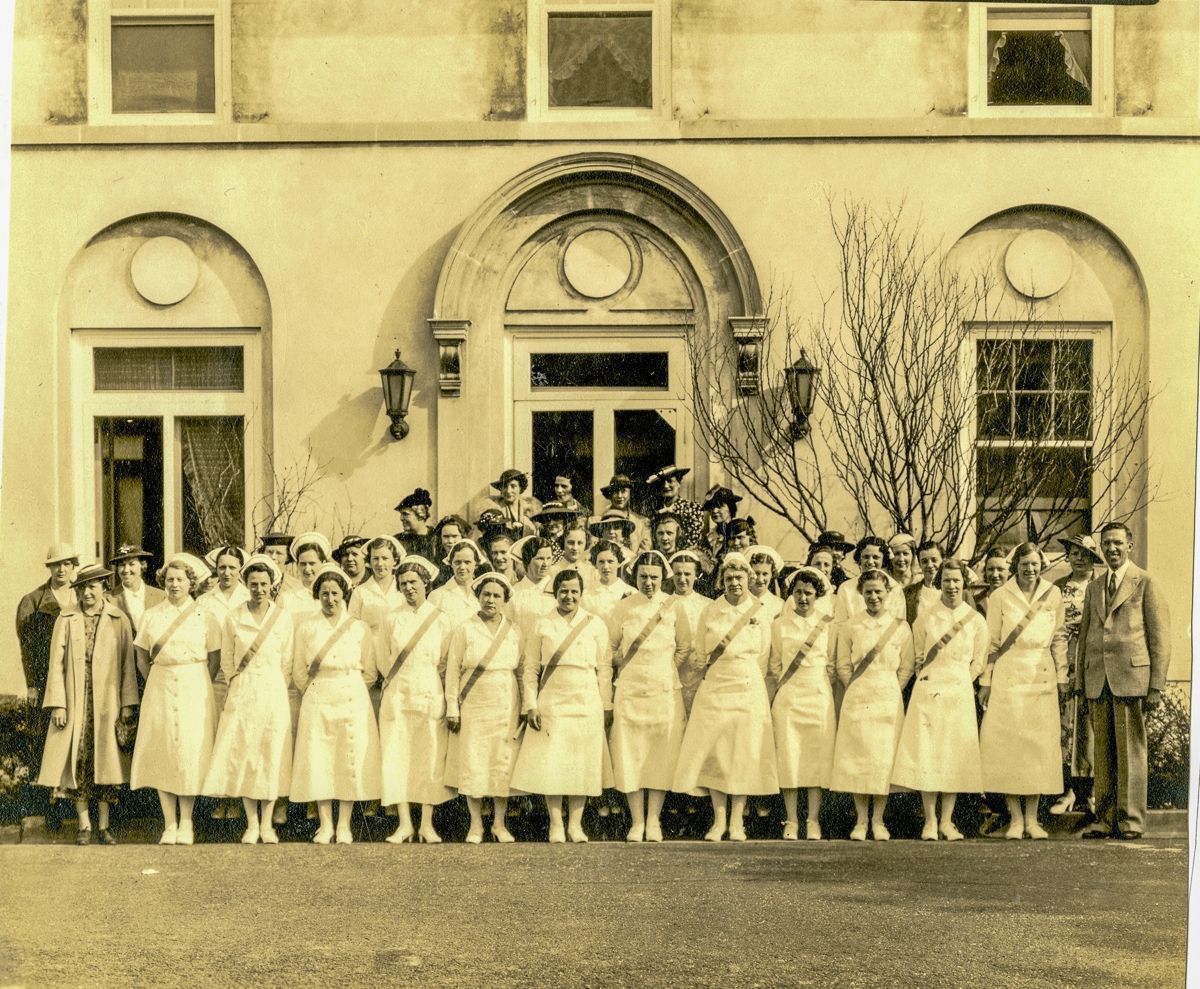 Nurses who had graduated from Greenwich Hospital's School of Nursing posing during a celebration of National Hospital Day.Collection