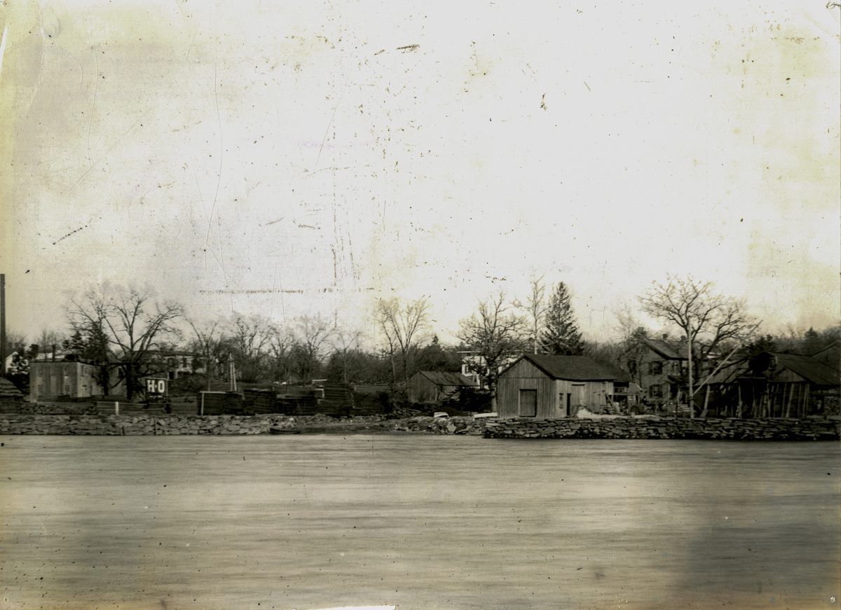 A view of Steamboat Road, looking east from Greenwich Harbor, with the Waterbury and June Lumber Company on the left and a boathouse in the foreground.Collection