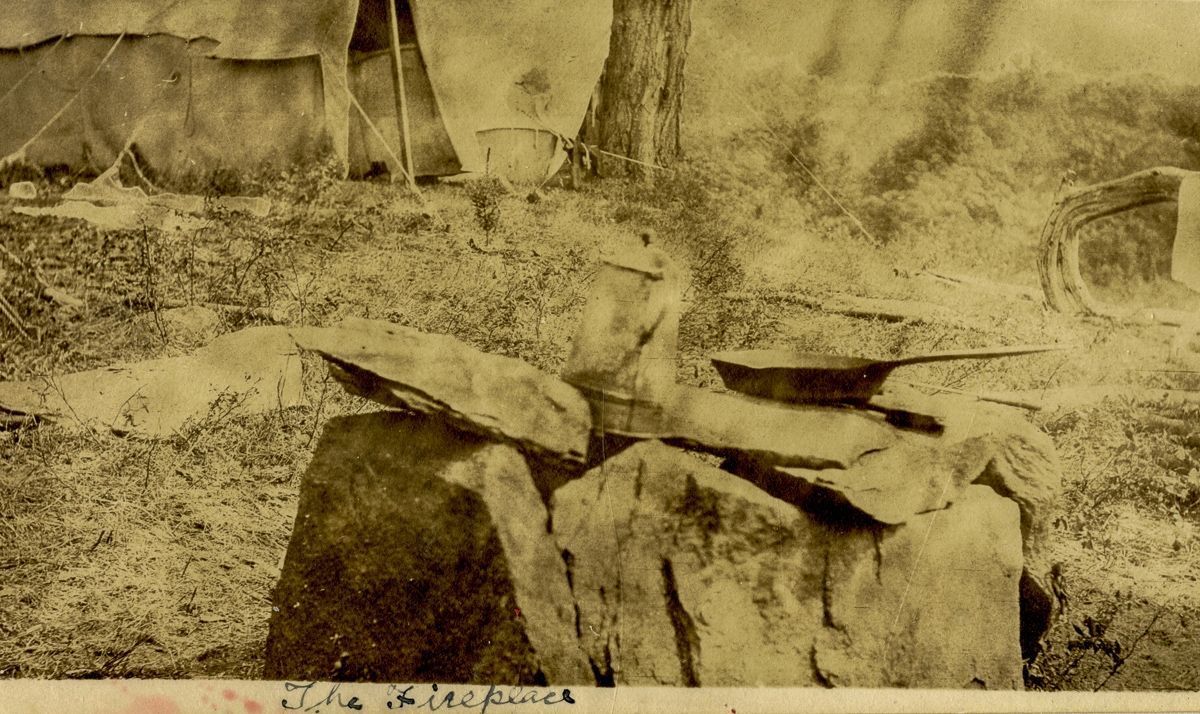 A cooking 'fireplace' in a Boy Scouts campsite with a kettle and frying pan.