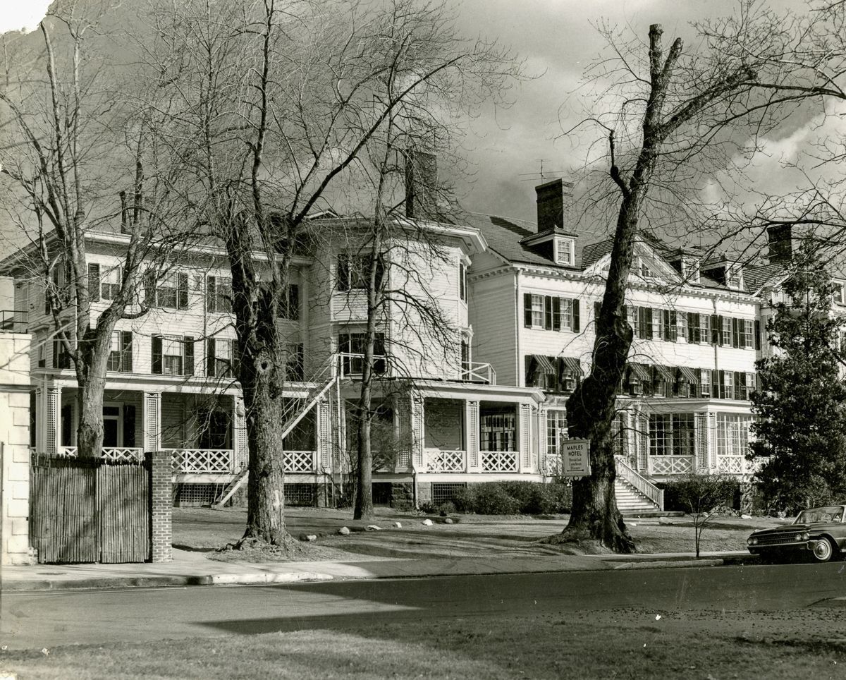 A view of the Maples Hotel on the corner of West Putnam Avenue and Benedict Place in Central Greenwich. Opened in 1899 as a hotel by Ms.'s Emma and Louise Willard after they leased the house that E.C. Benedict lived in, the hotel was eventually demolished in 1965 to make way for office buildings.Collection