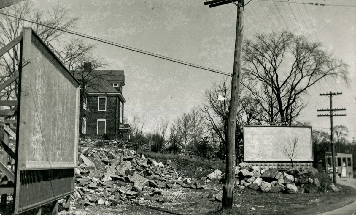 A view from the side of the North Mianus Community Center with rubble/excavated stone on a slope in the foreground of the image.Collection