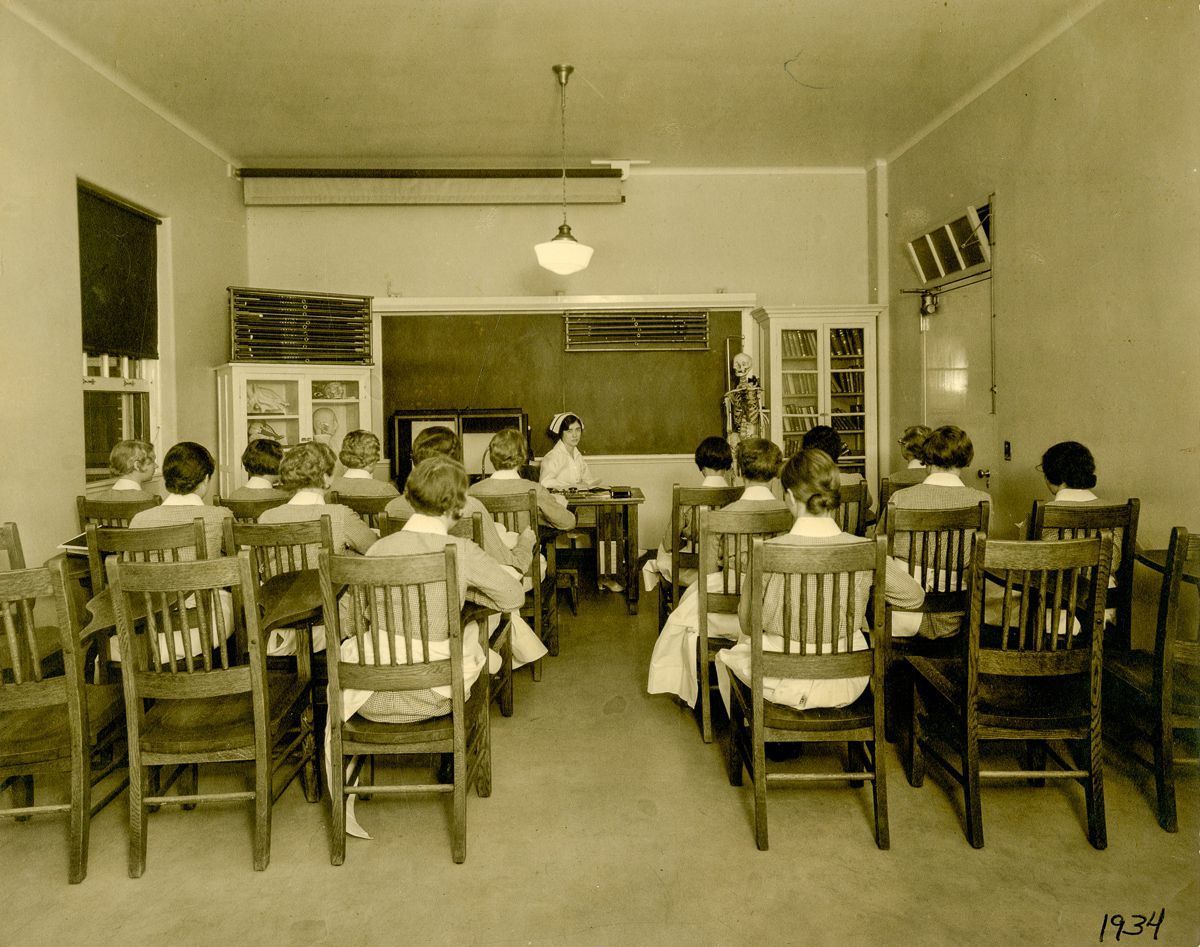 Nursing students, members of the class of 1934, in a classroom of the Greenwich Hospital School of Nursing.Collection