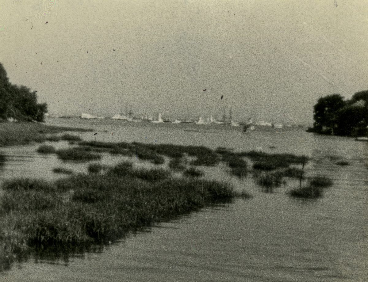 A view looking south along Indian Harbor towards where it opens into the Long Island Sound where a number of boats are sailing.Collection