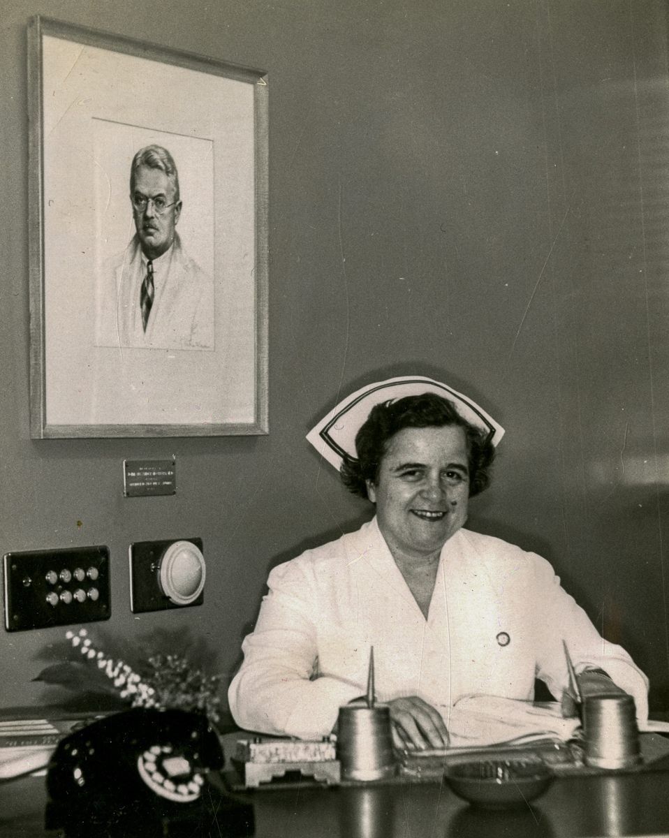 R.N. Louise Curcio sitting at a desk with a portrait of a Dr. McCreery on the wall behind her.