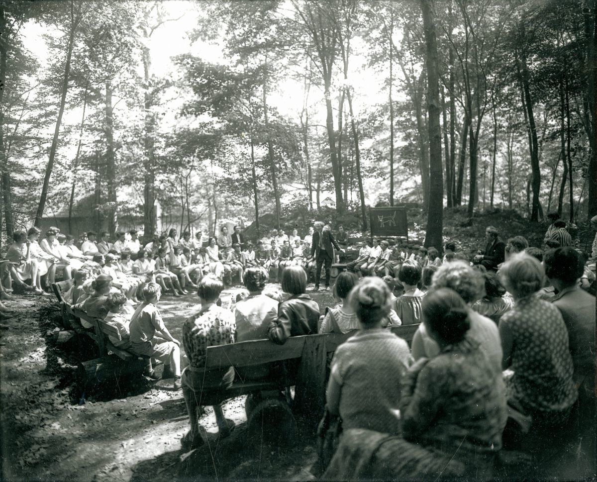 Members of the Woodcraft League and Ernest Thompson Seton, sitting on benches in a wooded area.Collection