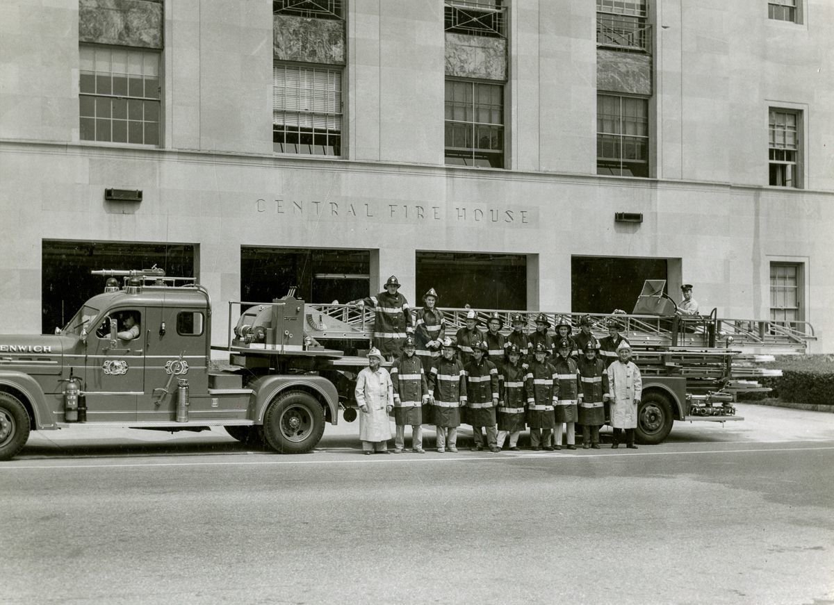 Firefighters standing by a fire engine outside the Central Fire House on Havemeyer Place.Collection