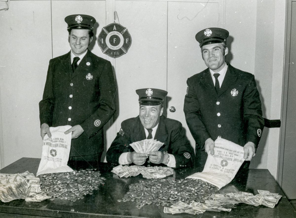Three members of the Amogerone Fire Company #1 posing with emptied bags of money.Collection