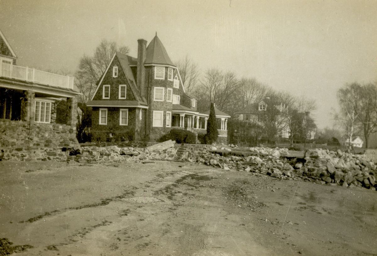 A view of a house that stood next to the Shoreham Club with storm damage visible to the seawall around the beach.Collection