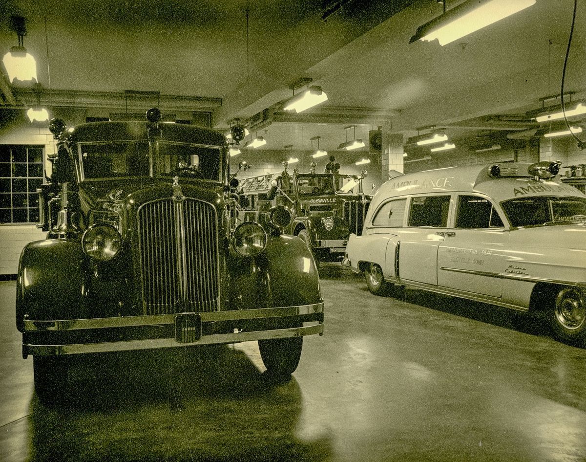 Fire engines in the garage of the Glenville Firehouse.Collection