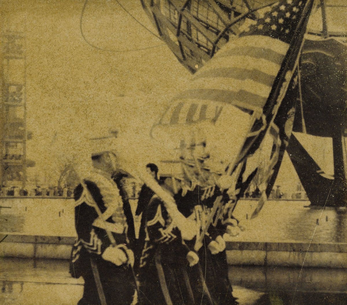 Members of the American Legion Drum Corps marching at a World's Fair.Collection