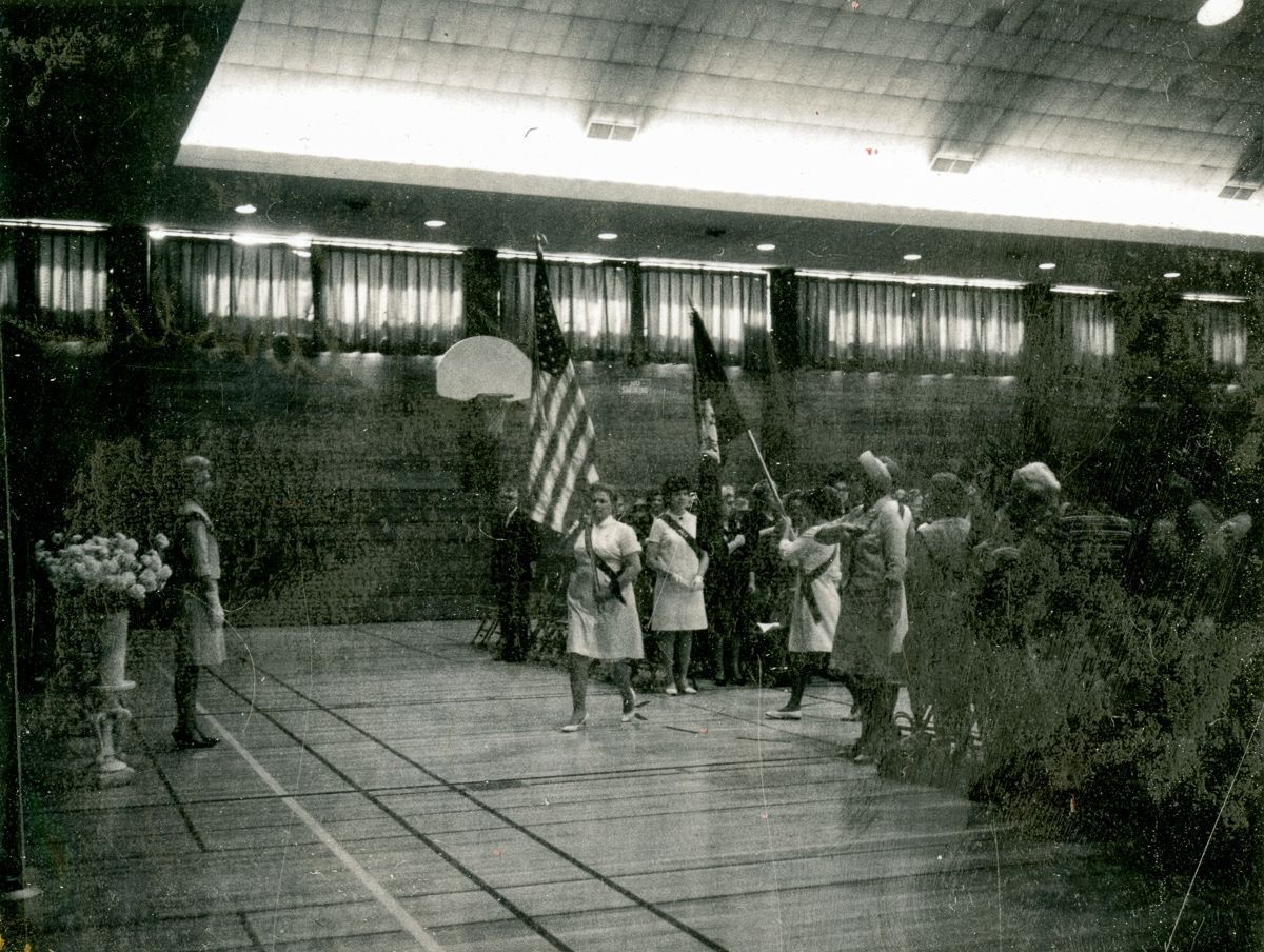 Women, some with flags, in the gymnasium of Eastern Greenwich Civic Center.