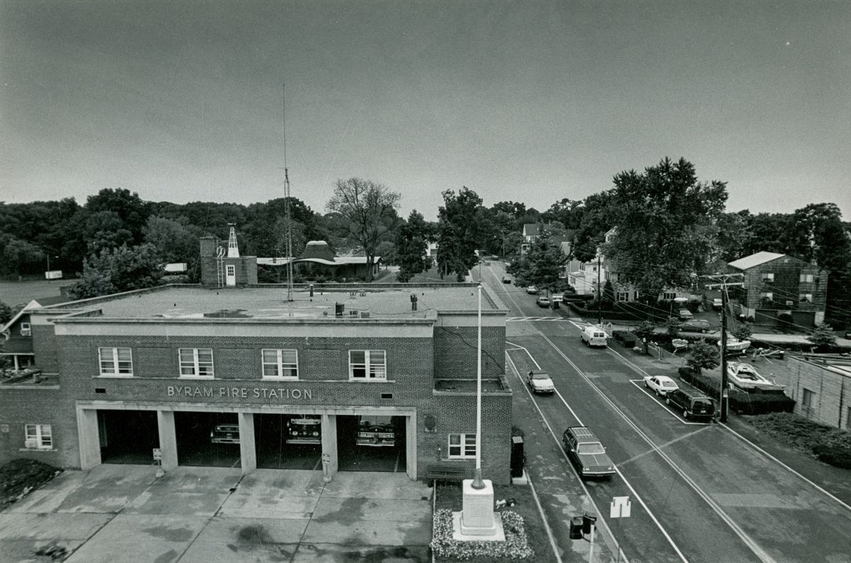 A view from an elevated position of the Byram fire departments station building; Byram Shubert library can be seen in the background.Collection