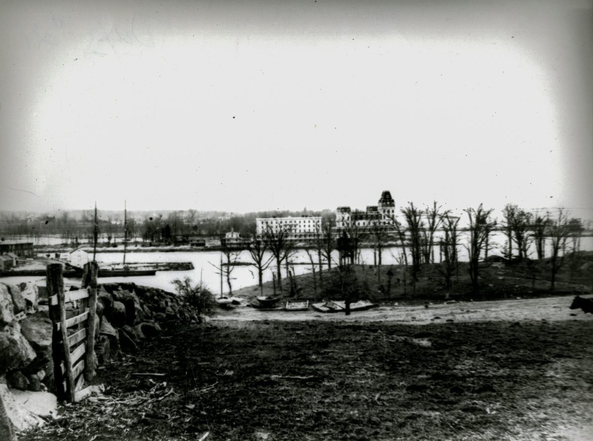 A view from Oliver Mead's farm on Belle Haven looking east across Greenwich Harbor and Smith Cove towards the Indian Harbor Hotel; the southern tip of Steamboat Road is visible in the middle of the image.Collection