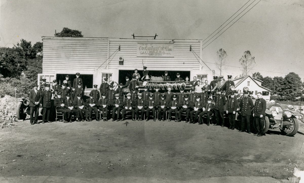 The members of the Cos Cob Fire Company #1 in front of their temporary headquarters.Collection