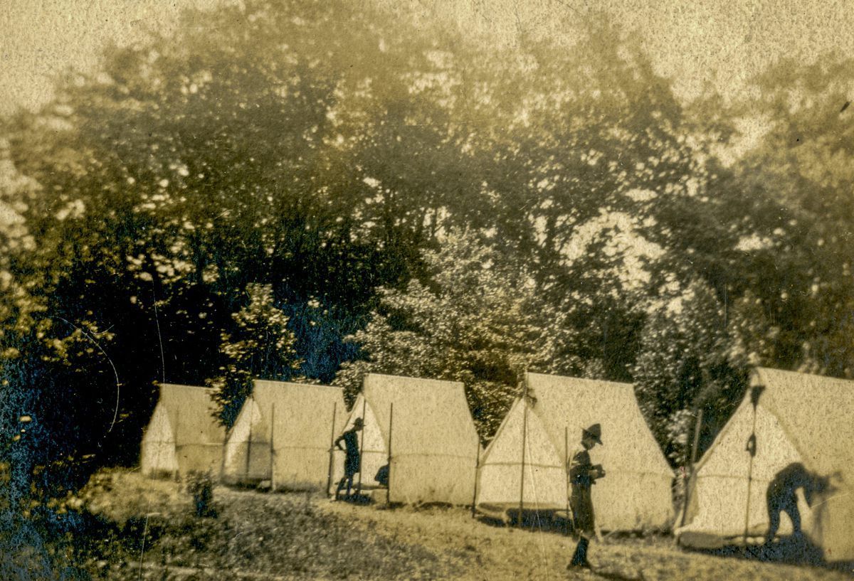 Boy Scouts setting up tents by 'Dewey Lake.'
