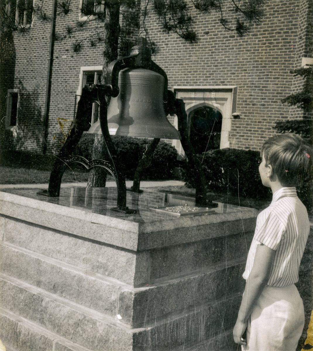 A boy looking at a bell that sits in front of the Cos Cob fire station.Collection