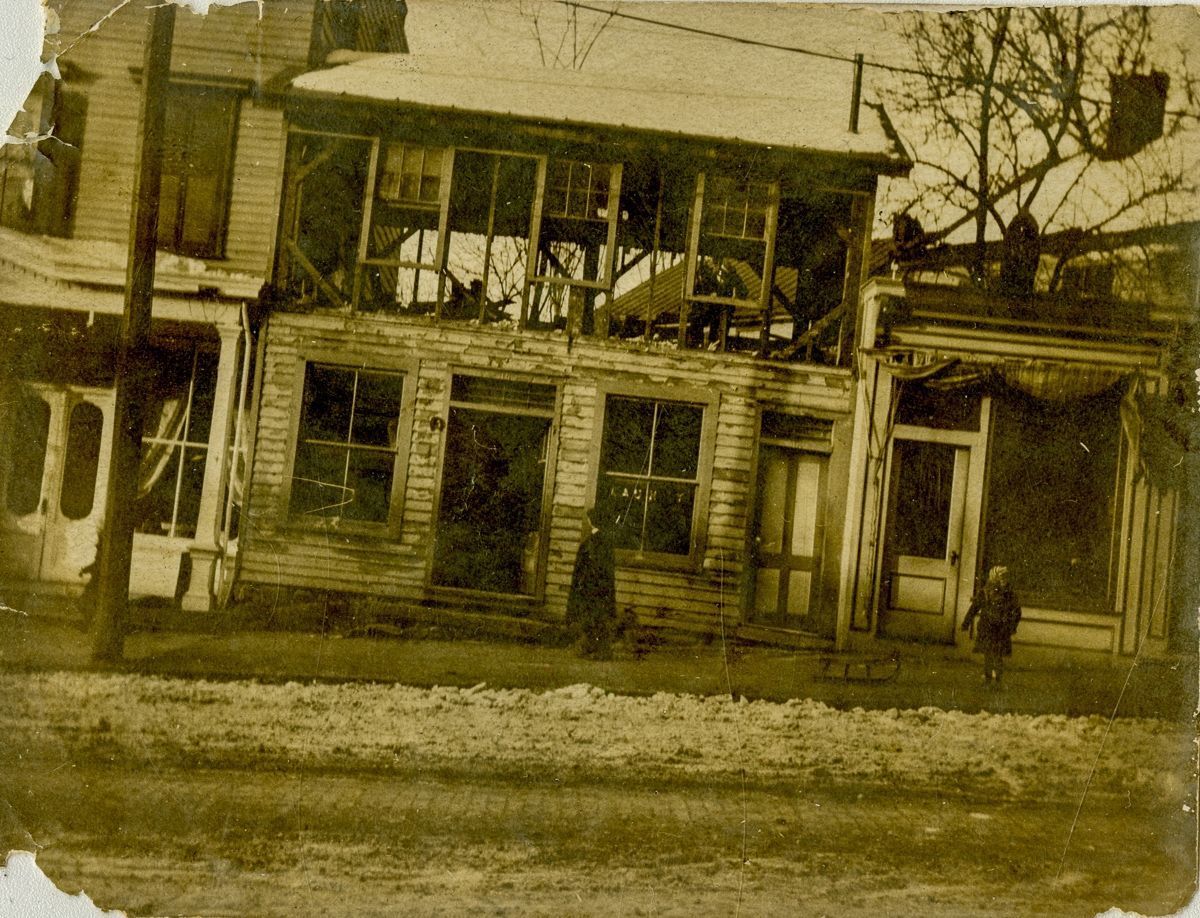 A person looking at a burnt building on the upper west side of Greenwich Avenue.
