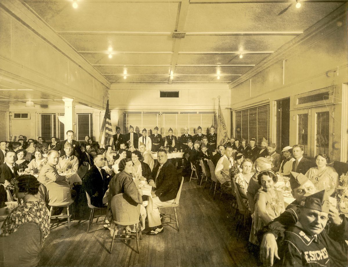 An American Legion reunion dinner, Mr. and Mrs. Ronald Whelan are at right against wall, the second and third from right.Collection