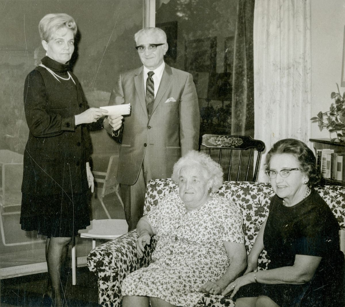 Members of the Soroptimist Club either presenting or receiving a check from a man, standing in the center of the image.Collection