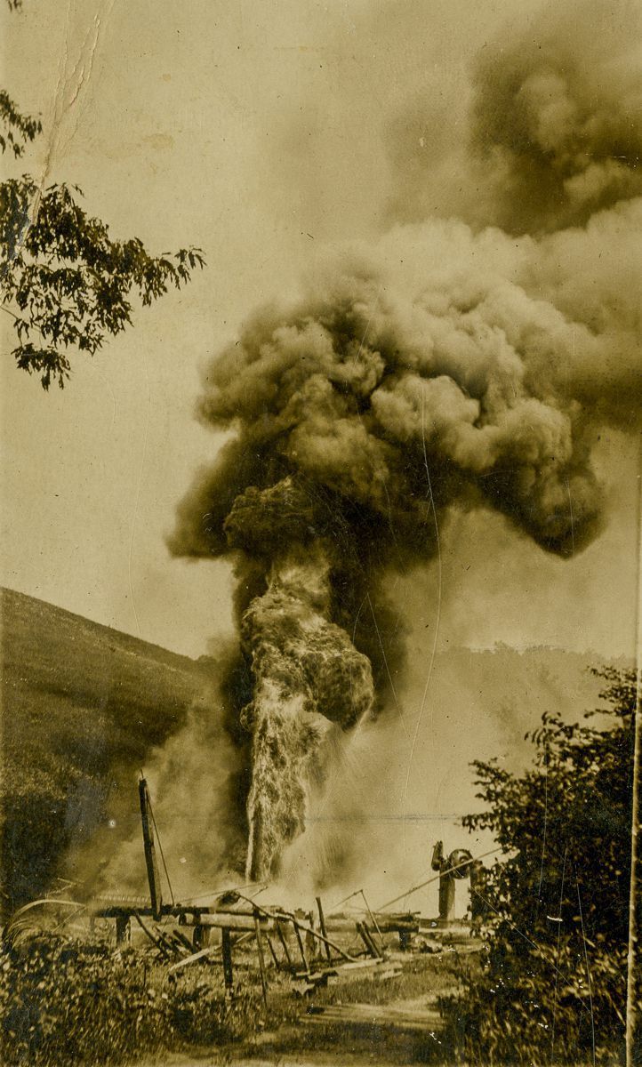 A postcard with an image of a fire coming out of what appears to be a pipeline.