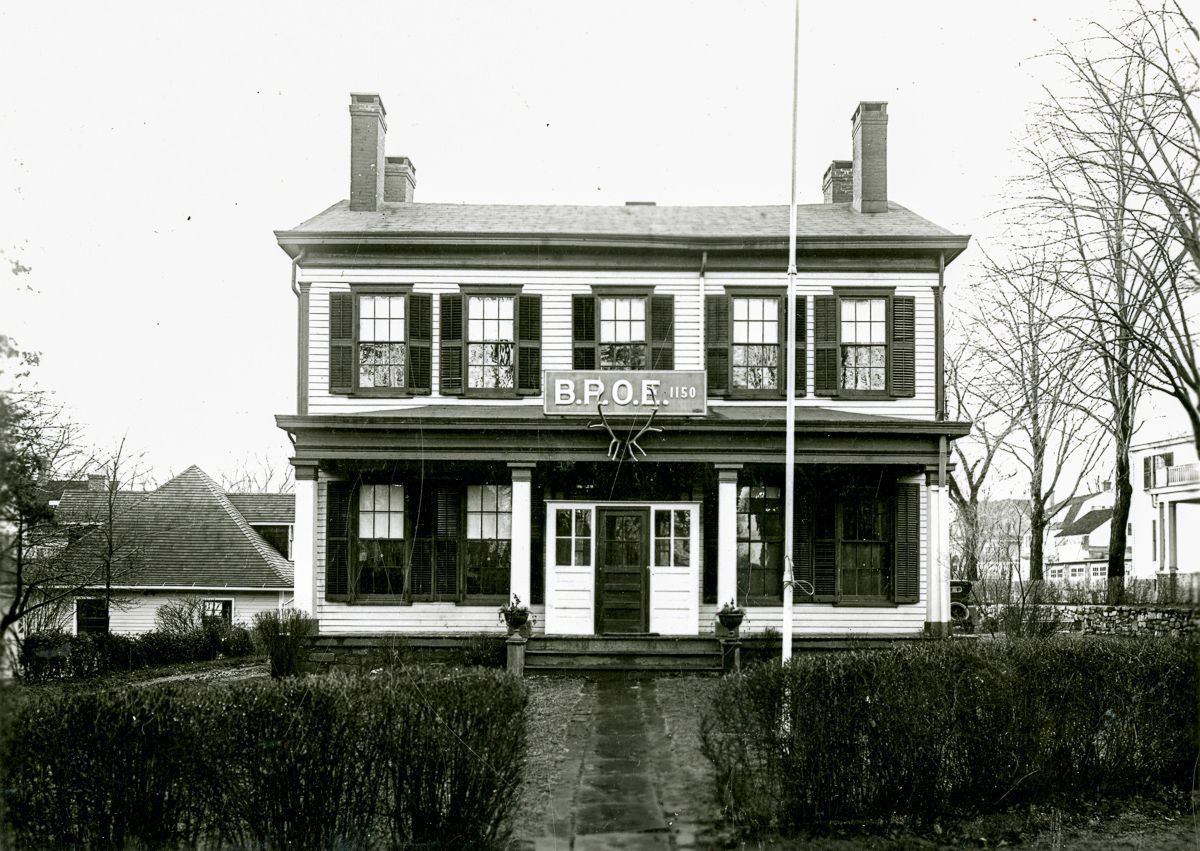 A view of the front of the Elk's Club's clubhouse, note the elk's antlers over the door.