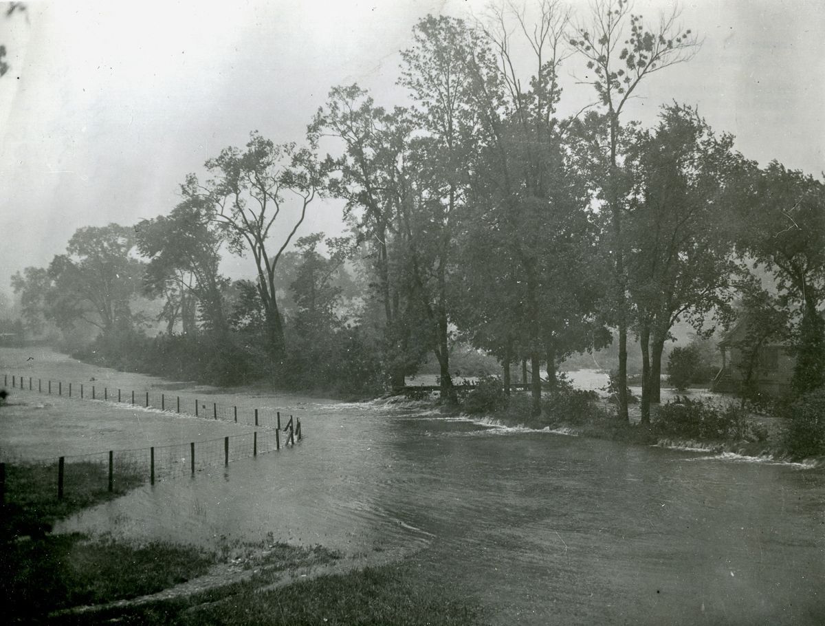 A view of Upland Street during major flooding of the Byram River caused by the "Great New England Hurricane" of 1938. The image was taken before the peak of the river's overflowing.Collection