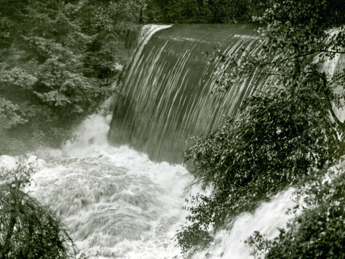 Floodwaters rushing down the Byram River and over the Pemberwick Road dam after the "Great New England Hurricane" of 1938.Collection