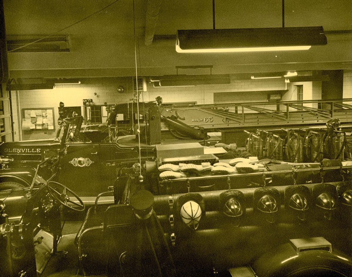 Fire engines in the garage of the Glenville Firehouse.Collection