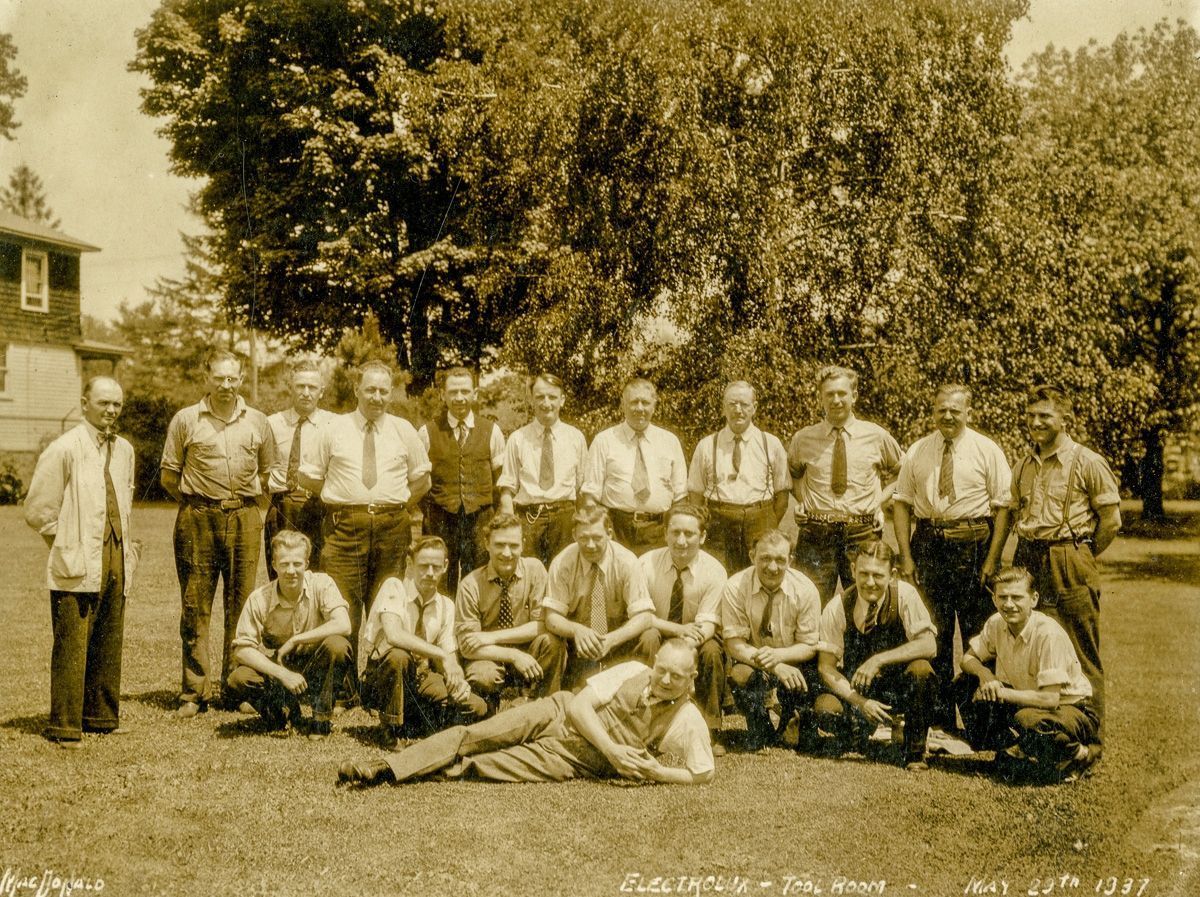 A portrait of Electrolux's tool room employees standing on a lawn on May 29th 1937.