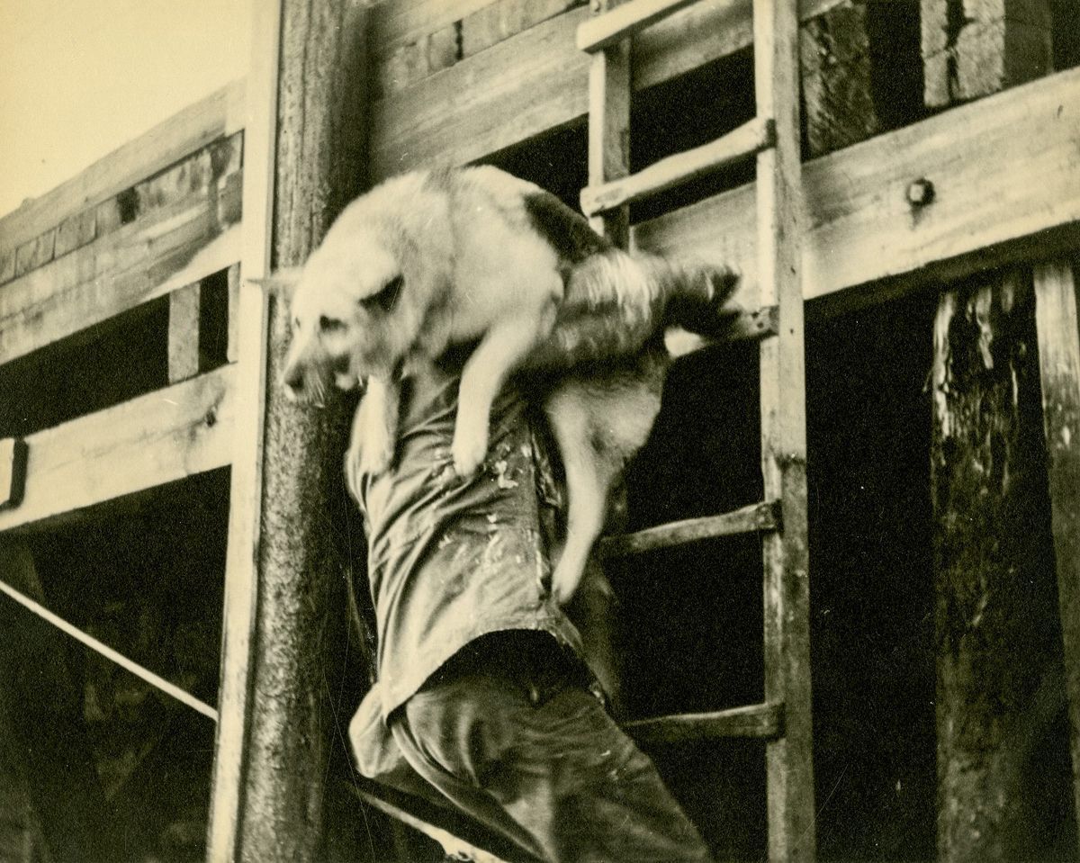 A man carrying his dog up a ladder on the pier of either Wee Captain Island or Island Beach.