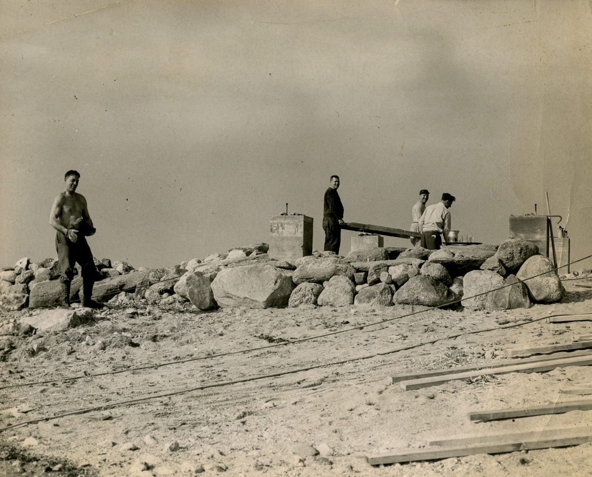 A group of men on Wee Captain Island, one is moving a rock and others are working in an area with four concrete columns.Collection