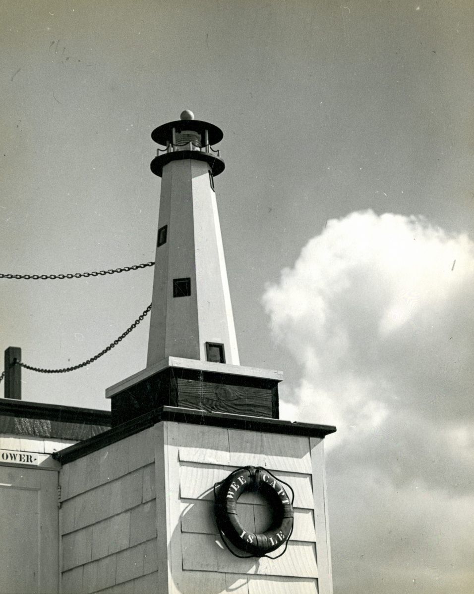 A miniature lighthouse standing on the shower building on Wee Captain Island.