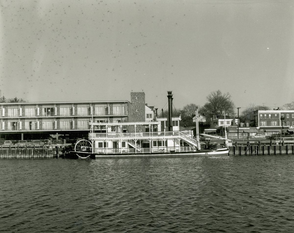 A view of the 'Showboat' moored in front of the Showboat Motor Inn.