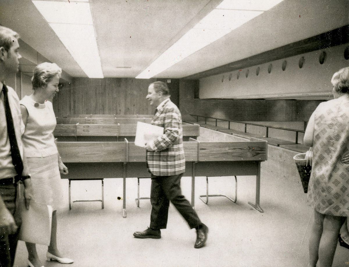 A group of people in a room full of desks in the Greenwich Library building on Greenwich Avenue.Collection