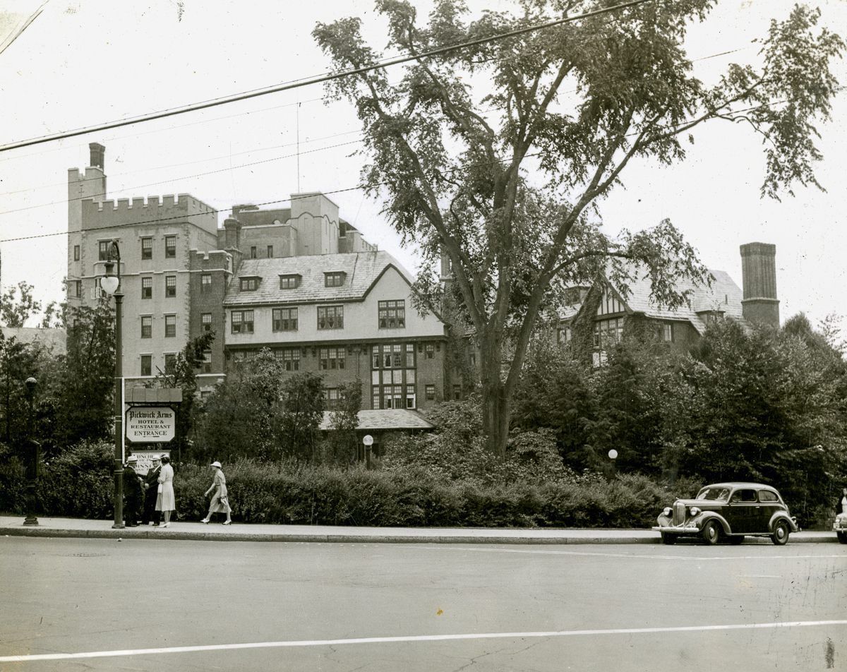 A view of the front of the Pickwick Arms hotel from intersection of the Post Road and Greenwich Avenue. The Pickwick Arms opened in 1920 and was closed in 1972.Collection