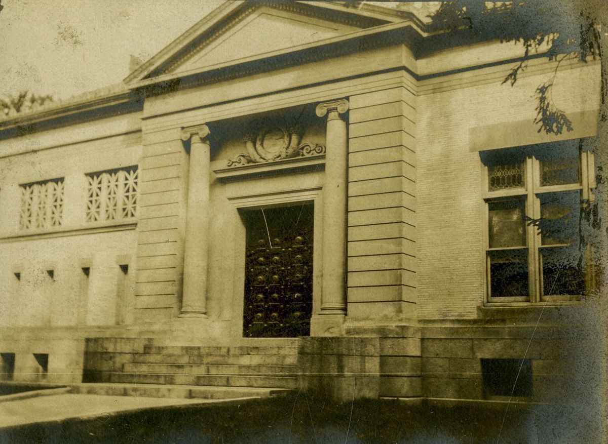 The entrance to the Greenwich Library at its second location on Greenwich Avenue at number 205; the building was built through a donation from Elizabeth Milbank Anderson and additional public donations.Collection