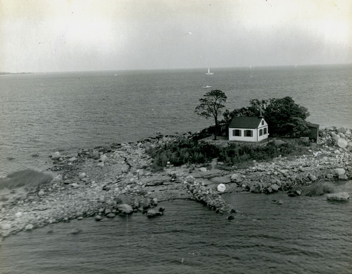 Aerial views of Wee Captain Island before and after a house was constructed on it.Collection